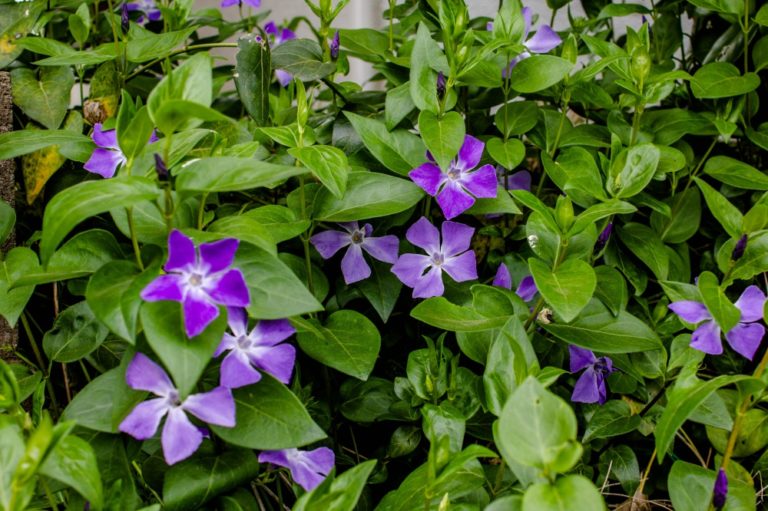 ツルニチニチソウ 春に紫色の花を咲かせる 花びらはひし形で5枚 きたむらいふ