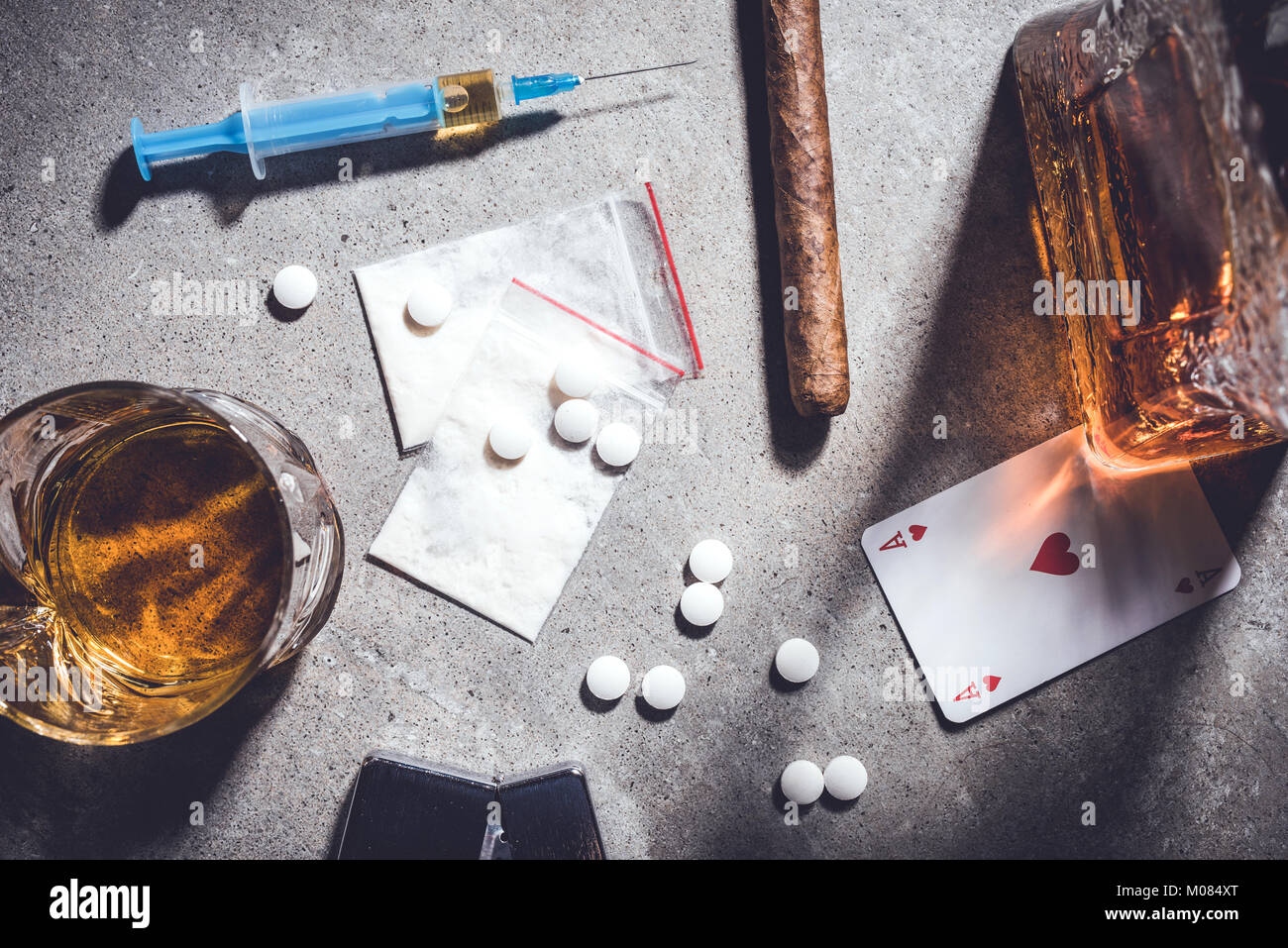 Hard drugs and alcohol on gray stone table. Top view Stock Photo Alamy