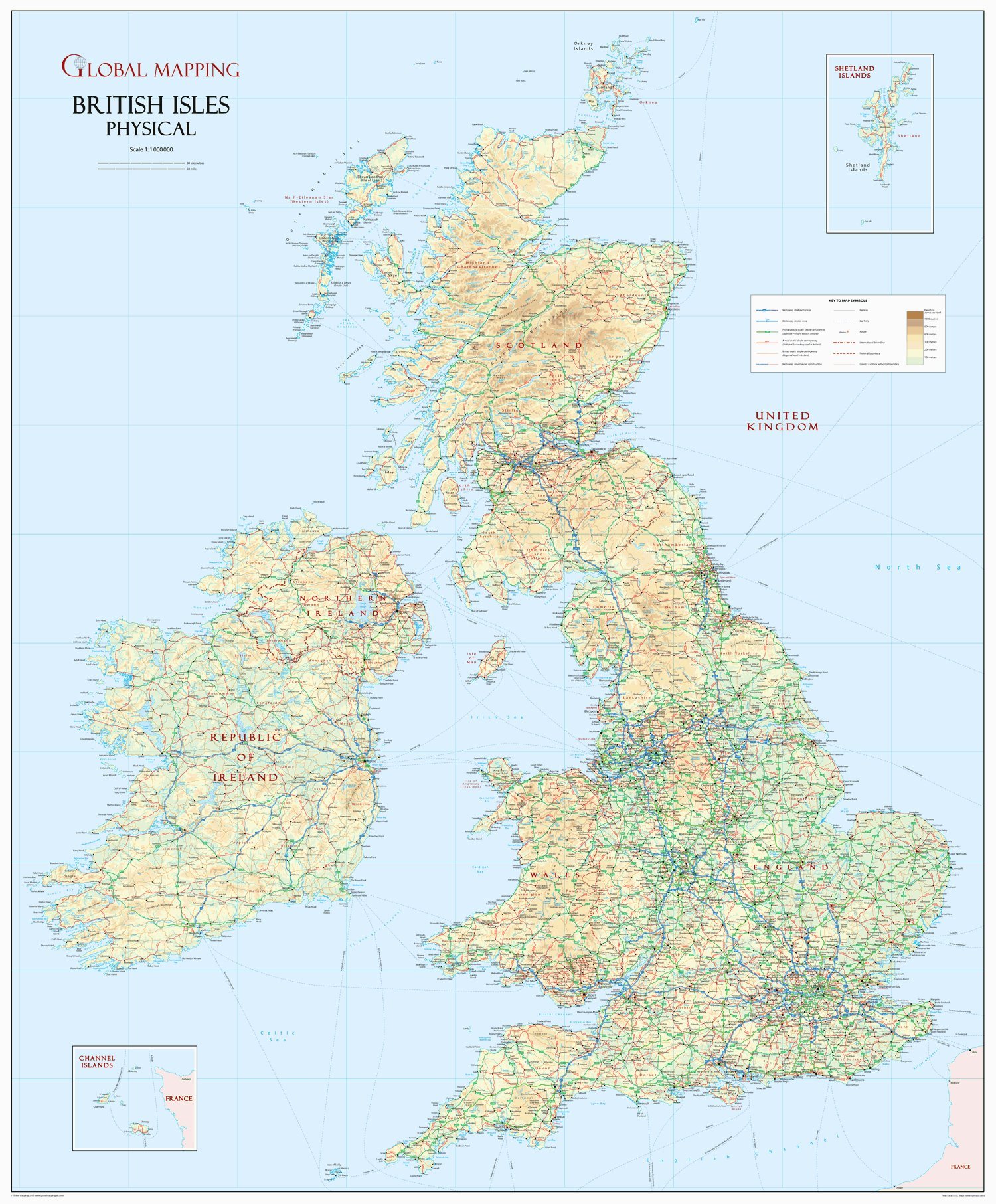 Physical map of British Isles with cities and towns. Free printable map of British Isles. Large detailed map of British Isles in format jpg.. United Kingdom on a World Wall Map: United Kingdom is one of nearly 200 countries illustrated on our Blue Ocean Laminated Map of the World. This map shows a combination of political and physical features. It includes country boundaries, major cities, major mountains in shaded relief, ocean depth in blue color gradient, along with many other.